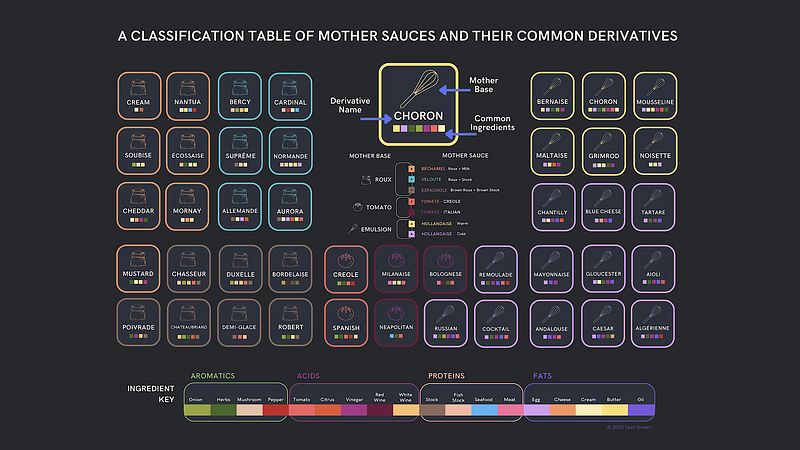 A Classification Table of Mother Sauces and Their Common Derivatives (2023) - dark version