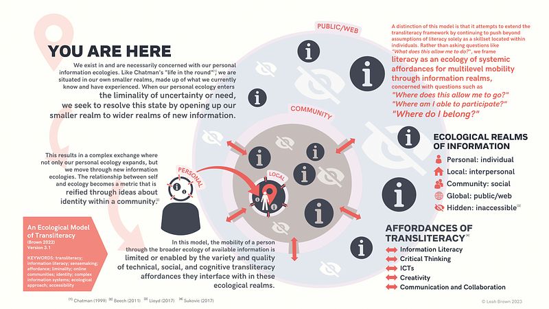 Note: This is very much a work in progress. There are a lot of details and definitions I have omitted from the infographic because I'm still tracking down sources, but that's the general overarching model at this stage, ie: a framing of literacy as a system of affordances that enables people to move through informational realms/ecologies, and ultimately, through society. It's my contention that frameworks of literacy must not locate responsibility solely with the individual who needs to develop skills in order to have agency, but also on the design of systems that limit or block folks from exercising agency/inhibit quality decision-making/limit who is able to participate in a specific realm of life, and so on. - LB